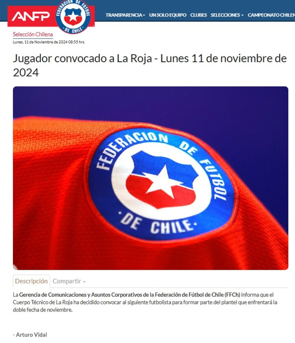 La convocatoria de la selección de ‘Cacique‘, Jorge Almirón, y Aníbal Mosa, presidente de Blanco y Negro, no fue una sorpresa, ya que ambos habían anunciado previamente la noticia durante la celebración por el título del Campeonato Nacional 2024. Así, la ANFP confirmó lo que se esperaba, anunciando: «La Federación de Fútbol de Chile (FFCh) comunica que el Cuerpo Técnico de La Roja ha elegido incluir a Arturo Vidal en la lista de jugadores convocados para los partidos de noviembre».